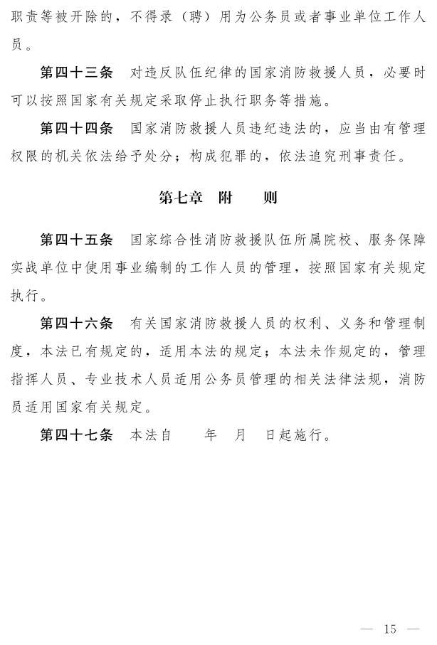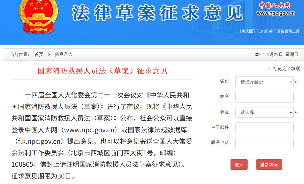 《中華人民共和國(guó) 消防救援人員法(草案)》已于2月27日公布,社會(huì)公眾可以直接登錄中國(guó)人大網(wǎng)或 法律法規(guī)數(shù)據(jù)庫(kù)提出意見,也可以將意見寄送全國(guó)人大常委會(huì)法制工作委員會(huì)(北京市西城區(qū)前門西大街1號(hào),郵編:100805。信封上請(qǐng)注明 消防救援人員法草案征求意見)。